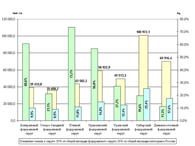 Рисунок 1.1 – Обеспеченность земельными ресурсами по округам в 2004 году