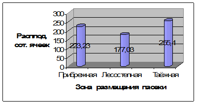 Следует отметить наличие большой разницы в количестве выращиваемого расплода между пчелиными семьями. Минимальное количество выращиваемого расплода в семьях колеблется от 122,99 сотен ячеек (лесостепная зона) до 219,45 сотен ячеек (таёжная зона), в прибрежной зоне - 174,18 сотен ячеек. Максимальные величины количества выращенного расплода принадлежат семьями прибрежной зоны и составляет 301,90 сотен ячеек, за ними следуют семьи таёжной зоны (292,85 сотен ячеек), и отстают семьи лесостепной зоны при значении показателя - 212,60 сотен ячеек.