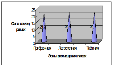 Данные рисунка показывают, что пчелиные семьи во всех изучаемых зонах к началу главного медосбора накопили достаточное количество пчёл для интенсивной работы на сборе и переработке нектара в период цветения липы. Количество пчёл в семьях в среднем по группе семей составила в прибрежной зоне 21,7 рамки, в лесостепной зоне - 22,3 рамки и в таёжной зоне - 22,1 рамки. Разница в силе семей между группами колеблется от 0,9% до 2,7%.