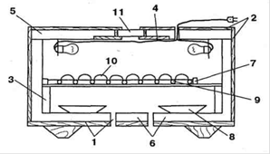 1 — дно с вентиляционными отверстиями; 2 — обшивка из фанеры; 3 — упор для установки лотка; 4 — электропроводка; 5 — крышка инкубатора; 6 — утеплитель; 7— рамка с сеткой (лоток); 8 — емкость для воды; 9 — прутки, перпендикулярные направлению движения; 10 —яйца; 11 —смотровое окно.