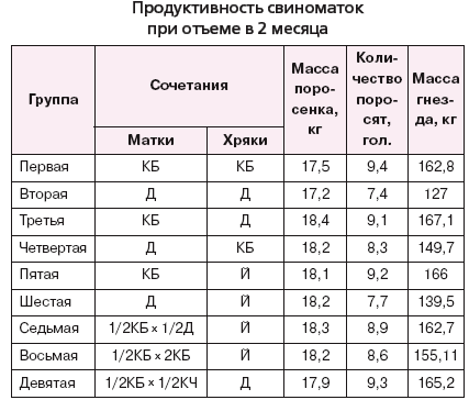 Классический эффект гетерозиса при использовании помесных маток по массе гнезда в двухмесячном возрасте — более 6 кг. Крупная белая порода наиболее целесообразна для разведения в качестве материнской. Аддитивный ее вклад в помесей по многоплодию составляет 1 голову, а по массе гнезда — 18 кг. Материнский аддитивный генетический эффект в число поросят при отъеме — 0,6 головы, по массе гнезда — 11 кг. То есть крупная белая порода — хорошая материнская основа в разных вариантах скрещивания (журнал «Животноводство России 12 2005г)