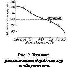 Стимулирующее действие ионизирующих излучений было установлено у кур-несушек. После облучения их в возрасте 14 мес в дозе 0,05 Гр яйценоскость увеличивалась в месяц в среднем на 18 %. Несушки, которые хорошо неслись до облучения, не изменили яйценоскости. Облучение несушек в дозе 0,2 Гр было менее благоприятно. Аналогичное стимулирующее действие ионизирующих излучений на рост молодняка и последующую продуктивность кур-несушек наблюдали ученые Казанского ветеринарного института (В.А.Киршинидр., 1979 г.), Омского ветеринарного института (В. И. Беркович, 1983 г.).