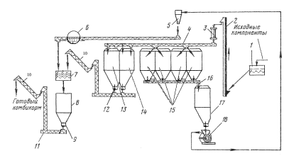 1-вибросепаратор; 2-нория; 3-магнитная колонка; 4-загрузочный шнек; 5-циклон; 6- просеивающее устройство;7-порционные весы; 8-бункер; 9-порциальный смеситель; 10 - наклонный шнек; 11 - нижний шнек; 12 - шнековый дозатор; 13-бункер для готовых БВД; 14 – бункер для травяной муки; 15 - зерновой бункер; 16 - дозирующий шнек; 17 –промежуточный бункер;18- дробилка.