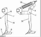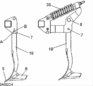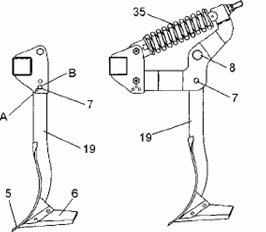 Каждая лапа (19) и держатель дисков оборудованы срезным предохранителем от перегрузки со срезным болтом (7), защищающим раму, лапы и держатели дисков от перегрузки. Если срезной болт (7) срезался, необходимо действовать следующим образом: