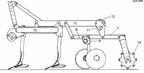 Если при полностью поднятом агрегате каток все еще касается почвы или находится на слишком малом расстоянии от почвы, то при опущенном культиваторе верхние забивные штифты (12) следует переставить в более низкое отверстие над брусьями. Верхнюю тягу трактора необходимо отрегулировать по длине так, чтобы в рабочем положении рама (15) имела приблизительно одинаковую высоту спереди и сзади и была приблизительно параллельна почве. Положение верхней тяги при этом зависит от требуемого прикатывающего действия катка (14).