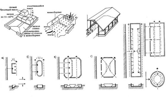 1. Открытые лотки с уклоном, устраиваемым в коровниках; длина до 10 м. 2. Навозная площадка со стоком для навозной жижи. 3. Ввод открытого лотка в отстойник, предназначенный для осаждения дурно пахнущих веществ. 4. Кирпичный или бетонный жижесборник с отдельными отсеками и отверстиями для откачки жижи в железобетонной крышке. 5. Жижесборник в виде группы секций, выложенных из фасонных камней и размещенных в общей железобетонной обойме, с переливами из секции в секцию. 6. Напорный жижесборник системы Бауэра. Преимущества: простота установки на скальных грунтах и при высоком уровне грунтовых вод. Возможность отказа от крышки, рассчитываемой на проезд по ней средств транспорта, снижает стоимость сооружения. 7. Вспомогательные операции для приготовления навоза по способу Кранца. Навоз наслаивается отдельными кучками. Благодаря возведению отсеков высотой до 3 м создается экономичное навозохранилище. 8. Навозная яма для создания запаса удобрений. Каждый месяц навоз складируется на отдельных участках и вывозится только после созревания. 9. Крытое навозохранилище с подачей навоза из хлева по подвесной дороге. 10. Основные формы навозохранилищ с обслуживанием наземными транспортными средствами, по Кордсу. М 1: 800. а— вывоз с одной продольной стороны, ширина навозохранилища 2,5 м (максимально допустимая при погрузке с одной стороны); б— вывоз с обеих продольных сторон, ширина навозохранилища удвоенная (2,5 х 2); e— вывоз по средним проездам, ширина навозохранилища— учетверенная (2,5 х 4); г — навозохранилище с угловыми проездами. 11. Обслуживание навозохранилищ подвесной дорогой с поворотными кругами или переводными стрелками.