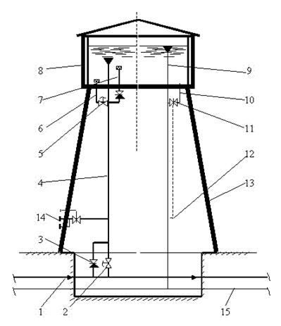 Схема водонапорной башни: 1 - водопроводная сеть; 2, 5 - электрическая задвижка; 3 - обратный клапан; 4 - подающе - отводящий трубопровод; 6 - трубопровод забора неприкосновенного запаса воды; 7 - трубопровод забора регулирующего запаса воды; 8 - шатер; 9 - переливная труба; 10 - грязевая труба; 11 - задвижка; 12 - руль управления задвижкой; 13 - ствол башни; 14 - патрубки для присоединения пожарной техники; 15 - канализационная сеть.