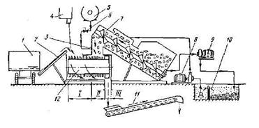 / — бункер-дозатор стебельчатых кормов; 2— приемный транспортер ТС-40М, 3— распылитель питательных растворов, 4 — дозатор концентрированный кормов и сухих сыпучих добавок; 5 — смеситель растворов, 6 — дозатор растворов, 7— шнековая мойка-дозатор корнеклубнеплодов, 8, 9 — соответственно водяной (2К-20/ЗО) и фекальный(ФГ 57,5/9,5) насосы, 10 — отстойник для води, 11 — выгрузной транспортер ТС-40М, 12 — измельчитель - смеситель; / — зона ножей, // — зона молотков, Ш — зона выгрузки кормосмесей