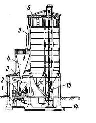 / — автовесы, 2 — загрузчик сухих кормов; 3 — реечная задвижка с электроприводом; 4 — бункер-накопитель; 5 — течка; 6 — шнек; 14 — разгрузочный шнек; /5 — нория