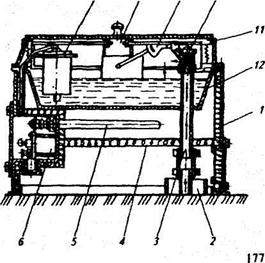 Автопоилка групповая с электроподогревом АГК-4А применяется для поения животных на открытых площадках в зимнее время. Ее можно устанавливать также внутри помещений. В корпусе автопоилки с теплоизоляцией находится поильная чаша, клапанно-поплавковый механизм, элемент и терморегулятор. Электронагреватель расположен под днищем чаши. В теплые месяцы года его отключают. Животные получают доступ к воде, нажав одну из четырех крышек-клапанов, расположенных в верхней части поилки. По мере снижения уровня воды в чаше поплавок опускается, клапан открывается, и вода из водопровода поступает в поилку. Темпера туру воды в чаше регулируют в пределах 4 .18 С, изменяя зазор между мембраной и микропереключателем. Она поддерживается автоматически с помощью терморе-гулятора. Поилка рассчитана на 80 . 100 животных.