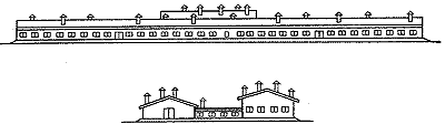 Конюшня состоит из двух блоков, соединенных между собой галереей длиной 12 м. Один блок площадью 102Х12 м предназначен для содержания в денниках 50 племенных и 6 ремонтных кобыл, другой размером 24Х12 м - для 6 жеребцов-производителей верховых, рысистых или тяжеловозных пород. В конюшне выделены следующие помещения: дежурная, сбруйная, фуражная, инвентарная, манеж для искусственного осеменения и ректального обследования кобыл, лаборатория, моечная, сбруйно-инвентарная вентиляционная камера, электрощитовая.