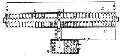 1 - денники для ремонтных кобыл, 2 - денники для племенных кобыл, 3 - помещение для удаления навоза, 4 - дежурная, 5-сбруйная, 6-фуражная, 7-инвентарная, 8 - тамбур, 9 - манеж, 10 - помещение для искусственного осемения и ректального обследования кобыл, 11 - помещение для апробации семени, 12 - моечная, 13 - денники для жеребцов, 14 - проход, 15 - сбруйно-инвентарная, 16 - вентиляционная камера, 17 - электрощитовая, l8 - подсобное помещение, 19 - коридор, 20 - паддок для кобыл (расстояние от стены конюшни до противоположного ограждения - 12 м), 21-паддок для жеребцов (те же расстояние - 10 м).