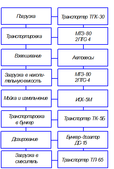 суточный расход корнеклубнеплодов Рккп = 18962,8 кг (см. табл. 3). Составленная схема технологического процесса подготовки кормов позволяет перейти к технологическому расчету оборудования, который сводится к определению производительности технологической линии, количества машин и вспомогательного оборудования.