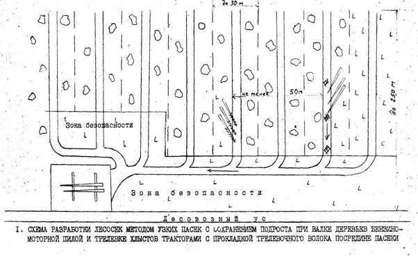 До начала работ нами, согласно "Правил рубок ." должно быть произведено отграничение погрузочных площадок, складов, трасс, магистральных волоков, дорог и других производственных площадок, пасек и пасечных волоков. Пасеку шириной 25 разбиваем трелевочным волоком на две полупасеки, узкие ленты. Разработку пасеки будем начинать с ближнего конца. Деревья будем валить бензопилой «Хускварна» вершиной на волок под острым углом (до 35) к нему. Максимальный угол образуется при повале деревьев, расположенных на границе пасеки, вдали от волока. У всех остальных деревьев этот угол будет колебаться в пределах 2-30. Трелевка деревьев осуществляется за вершину трактором ТТР-401. Сучья обрубаются на пасеке бензопилой «Хускварна». Благодаря острому углу повала деревьев хлысты в процессе трелевки двигаются вдоль своей оси без значительных поворотов. Схема позволяет сохранить до 65% подроста.