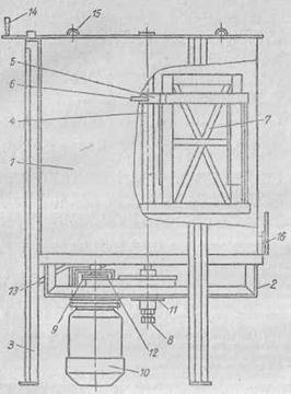 Внутрь бака установлен ротор, состоящий из вала 4 с закрепленными на нем с помощью ступиц 5 и спиц 6 ободами с ячейками для установки в них кассет 7.