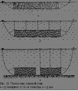 Речная плавная сеть представляет собой прямоугольное сетное полотно с размером ячей, соответствующим размеру ловимой рыбы. Длина сети в посадке колеблется от 50-70 до 250- 300 и даже до 600 м, в зависимости от ширины плеса и условий лова. Высота сети также различна: от 1,5-2 до 8 м. Длинные сети составляют из нескольких коротких, которые связываю с приухами, а сетные полотна съячеивают или соединяют шворкой в рубец. Сеть садят на верхнюю и нижнюю подборы с посадочным коэффициентом и=0,5. Такая густая посадка увеличивав путлявость сетного полотна, а следовательно, и уловистость сети.