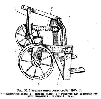 Выкопочная скоба НВС-1,2 выполненная из двух вертикальных ножей и горизонтального лемеха предназначена для выкопки сеянцев хвойных и лиственных пород. Состоит из скобы двух опорных коле, навески, рамы. Для крошения пласта к лемеху привалены два удлинителя. Угол наклона лемеха регулируется в пределах 9-23°. Боковые ножи и лемех скобы с боков и снизу подрезают пласт, который вместе с растениями поступает непрерывной лентой на удлинители и разрушается, что облегчает выборку растений.