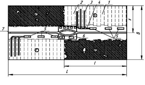 А,Б,В,Г — делянки; 1 — пасеки; 2 — пасечные ленты; 3 — пасечные волоки; 4 — магистральные волоки; 5 — погрузочные пункты; 6 — обустроенный центр лесосеки, 7 — лесовозный ус; В — ширина лесосеки; х — ширина делянки; L — длина лесосеки; l — длина делянки.