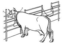 1 — кормушка; 2 — поворотная труба для фиксации животных;