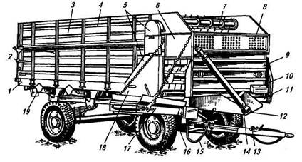 / — днище кузова; 2 — задний борт; 3 — боковой борт; 4 — надставной борт; 5—ограждающие щитки; б—боковина; 7—блок битеров; 8— щит-отражатель; 9 — передний борт; 10— ящик для инструментов; 11 — поперечный транспортер; 12 — привод; 13 — тормозное устройство; 14 — телескопический вал; 15 — гидравлический механизм подъема дополнительного транспортера; 16—ходовая часть; 17—дополнительный наклонный транспортер; 18—цепь; 19— задний фонарь и указатель поворота