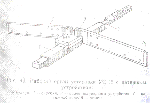 Установка работает в возвратно-поступательном режиме. При рабочем ходе скребки в одном навозном проходе при трении о пол раскрываются во всю ширину канала, захватывают навоз и перемещают его к люку, находящемуся над поперечным навозным каналом. В это время скребки во втором навозном проходе складываются и перемещаются вхолостую в противоположную сторону. После выгрузки навоза одним скрепером происходит реверсирование контура, и в работу вступает второй скрепер. Далее циклы повторяются. Установка работает 15-20 часов в сутки. Она может убирать твердый, жидкий и полужидкий навоз с остатками кормов и подстилкой без предварительного подгребания их в кучи. Так как скорость рабочих органов невелика(2,4 м/мин), они в процессе движения не травмируют животных.