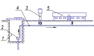 Рис. 1. Конструктивно-технологическая схема ПТЛ водоснабжения и автопоения: 1 – насосная станция; 2 – центробежный насос; 3 – водонапорная башня; 4 – водопроводная сеть; 5 – водопотребитель (поилки).