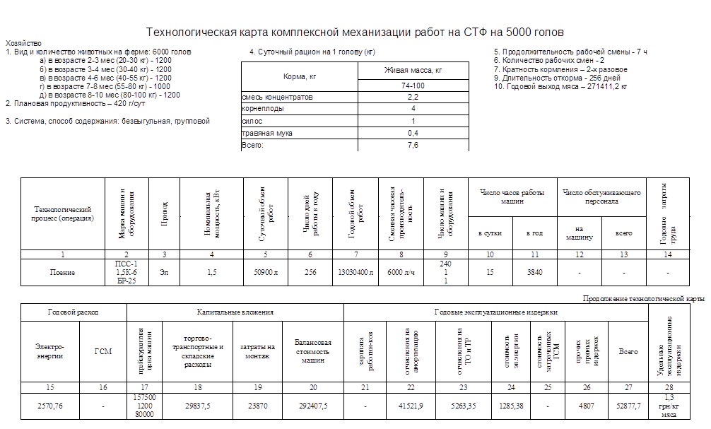 Графа 5 – объем работ в сутки – заполняют для каждой операции с учетом суточных норм кормления, расхода подстилки, выхода навоза, количества продукции, времени на выполнение операции в соответствии с принятым на ферме распорядком дня. 50900 л.