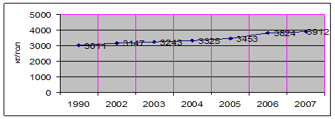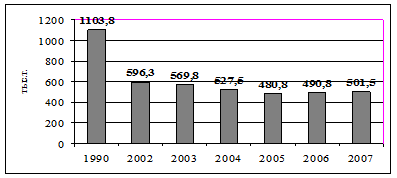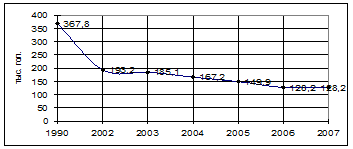В то же время в области наблюдается тенденция спада производства молока, которая была остановлена, начиная с 2005 года и по сегодняшний день (рис. 5.). Это связано с небольшим ростом продуктивности и стабилизацией поголовья.