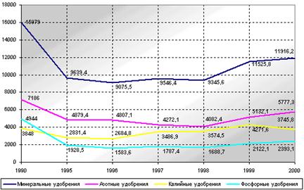 К 2000 г. производство минеральных удобрений сократилось по сравнению с 1990 г. в 1,3 раза, в том числе азотных - в 1,2 раза, фосфорных - в 2,1 раза, производство калийных удобрений увеличились в 1,03 раза (рис.1).