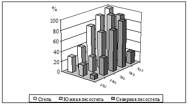 Характерно, что во влажные и прохладные годы, благоприятные для формирования высокого урожая (например, 2001), Характеризуются наименьшим удельным весом качественного продовольственного зерна, а засушливые и жаркие – максимальным (1998, 1999 годы).