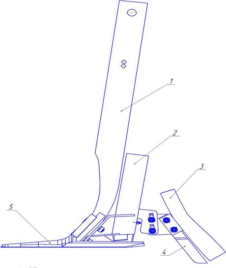 1 – стойка; 2 – колено; 3 – раструб; 4 – долото; 5 – лапа культиваторная;