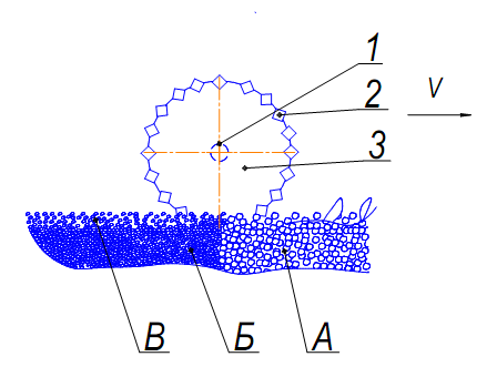 Рисунок 27 – Схема работы катка струнного 1-вал; 2-струна; 3-диск.