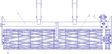 Каток в сборе (рисунок 29) служит для выравнивания и уплотнения почвы засеянной зоны и передачи вращения на валы высевающих и туковых аппаратов сеялки. Состоит из рамы катка 1, со стойками для присоединения к сеялке, 2 – струны непосредственного рабочего органа, 3 - блока звездочек, 4 – вала на подшипниковых опорах.