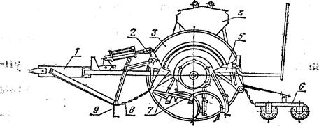 1 -сцепное устройство; 2 - подъемное устройство рабочих органов; 3 - колесо; 4 - ящик для семян; 5 - рама; 6 – прутковые катки; 7 - сошники; 8 - ограничительная цепь; 9 – выравниватель.