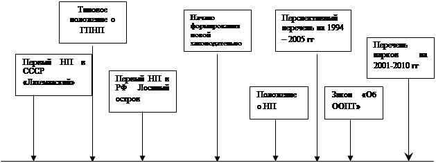 Рассмотрим кратко содержание этапов становления Национальных парков по Круглову В.В. и Гармидеру К.П.[6].