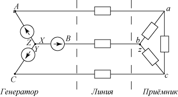 Фазы трёхфазного потребителя, так же как и у трёхфазного источника, соединяются либо звездой (соединение точек x, y, z), либо треугольником (соединение a – y, b – z, c – x).