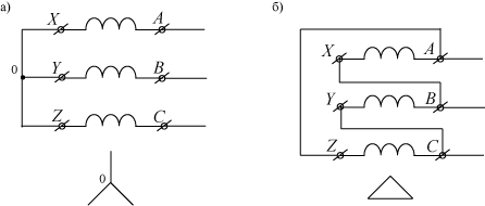 Практически используются две схемы симметричных соединений трёх фаз: звезда (рис. 2а), когда соединяются вместе концы всех обмоток X, Y, Z, и треугольник (рис. 2б), когда соединяются начало одной обмотки с концом другой в последовательности A – Z, B – X, C – Y.