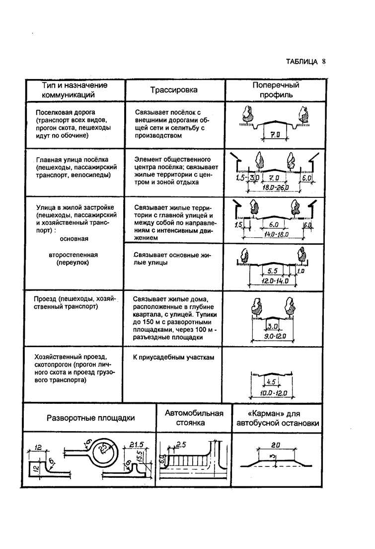 Скотопрогоны и хозяйственные проезды трассируются так, чтобы выгон скота на пастбище, доставку химических удобрений, кормов, навоза можно было осуществлять не по жилым улицам и проездам. Поперечный профиль поселковых улиц и проездов, габариты разворотных площадок, автостоянок, «карманов» на автобусных остановках принимается по табл.8.