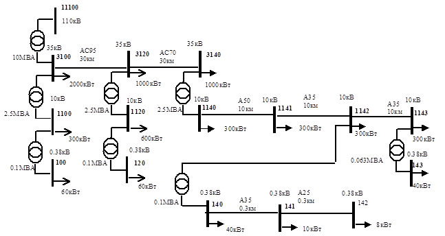Рассматривается схема сети приведенная на рис. 1. На схеме отражаются параметры элементов сети и величины нагрузок для режима зимнего максимума.