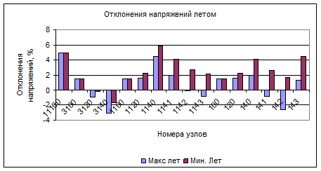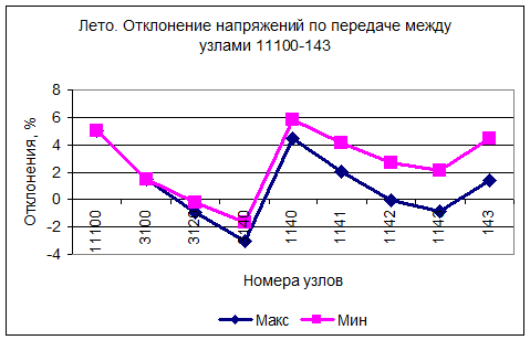 Для наглядного отображения изменения напряжения узлов сети по мере их удаления от центра питания используется график отклонений напряжений, показанный на рис.3 вдоль ЛЭП до самого удаленного узла. На рис. 3 видны значительные потери напряжения в ЛЭП и влияние добавок напряжения на трансформаторах на величины отклонений напряжения