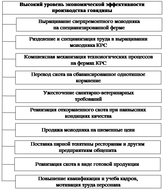 На рисунке 7 схематически показаны комплексы организационно-технологических и организационно-экономических мероприятий, направленных на повышение экономической эффективности выращивания и откорма молодняка КРС, т.е. на производство говядины и выращивание племенного скота.
