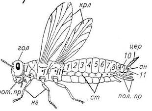 гол — голова; I, II, III - последовательные сегменты грудного отдела; 1—7 — прегенитальные; 8, 9— генитальные; 10, 11 — постгенитальные сегменты брюшка; крл — крылья; нг — ноги; пол. пр — половые придатки; пер — перки; рот. пр –- ротовые придатки; ан — анальное отверстие; cm — стигмы.