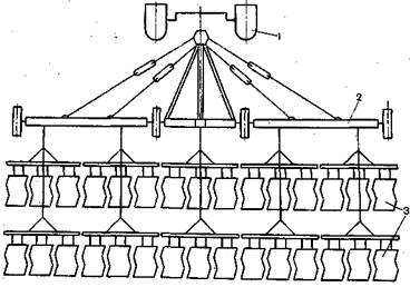 Рисунок 3.1 - Схема широкозахватного агрегата с тяжелыми зубовыми боронами ЗБЗТС-1,0, прикрепленными к сцепке в два поперечных ряда.