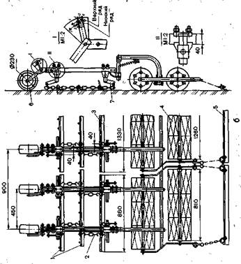 К каждому культиватору УСМК-5.4В или КРД-5,4 для закрытия влаги прилагается пять комплектов трехбрусных шарнирных шлейфов, из них два комплекта укороченных и три удлиненных. Укороченные трехбрусные шарнирные шлейфы устанавливают по краям культиватора, а удлиненные трехбрусные шлейфы - в середине культиватора, т. е. между укороченными (рис. 3.2).