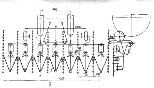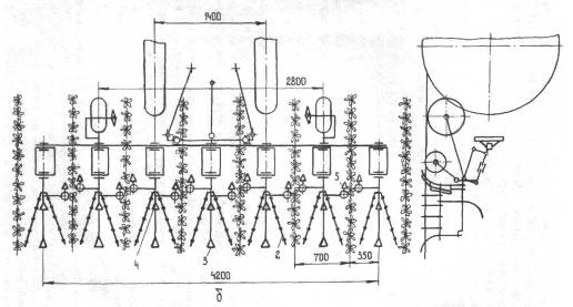 1 - стрельчатая лапа, 2 - рыхлитель зубовый, 3 - рыхлительная лапа-стабилизатор, 4 - нерабочая рыхлительная лапа, 5 - подкормочный нож