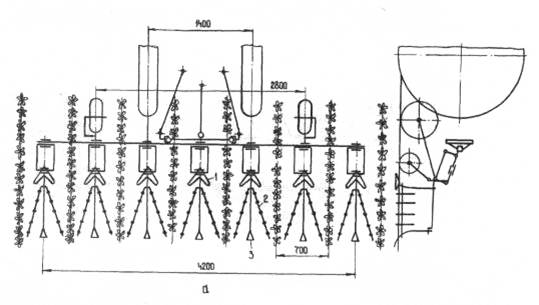 Рисунок 3.10 - Схема расстановки рабочих органов агрегата на первых обработках всходов кормовой свеклы при большой (а) и малой (б) засоренности полей сорняками.