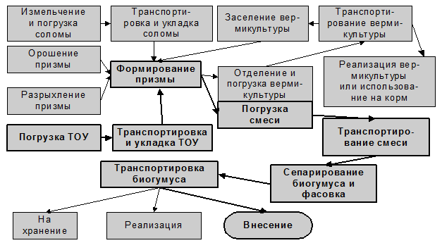 Сырой навоз в процессе переработки его в биогумус теряет примерно 60% исходной массы. Количество биогумуса, полученного из подготовленного субстрата, составляет 40-42% (при влажности 50%) от исходной массы. Технологический процесс приготовления биогумуса представлен на рис. 1.4. Процесс преобразования навоза в готовое удобрение и его использование хозяйством выделен на схеме полужирным шрифтом.