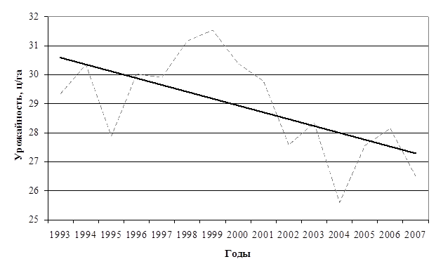 Анализируя динамику урожайности основных сельскохозяйственных культур за достаточно длительный период можно заметить тенденцию снижения урожайности. В качестве примера нами была рассмотрена урожайность озимой пшеницы, как культуры имеющей наибольший удельный вес среди прочих культур за ряд лет и отражена в виде графика на рис. 3.