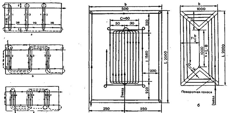 Рис.2. .Схема движения агрегата при разбивке загонов для вспашки: а — с чередованием затонов; б, в — с формированием свальных гребней в три и четыре прохода; 1—4 — проходы агрегата;
