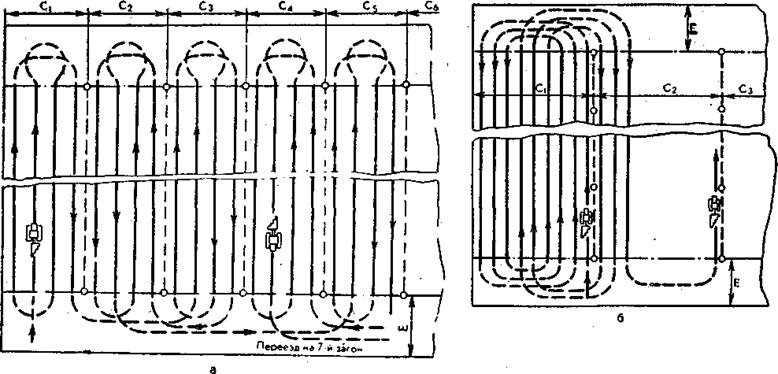 Рис. 5. Схема движения агрегата при работе петлевым способом с чередованием загонов (а) и беспетлевым комбинированным способом (6): С1, С2., С3 — ширина загонов; Е — ширина поворотной полосы